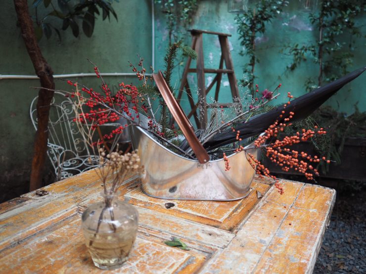 Çiçeklerin arasından dar koridora geçip de arka bahçeye çıktığınızda hemen fotoğraf makinenizi aratacak bir tablo çıkıyor karşınıza. Eskitilmiş ahşap ve mavi masa, bir köşedeki inanılmaz güzel nostaljik boy aynası, turuncu sandalye, içinden çiçek fışkıran sandık derken her köşesini ayrı ayrı incelemek istiyorsunuz. Etrafı inceleme bitip de bahçenin keyfini çıkarmak için oturduğunuzda da minik ama leziz bir menü bekliyor.