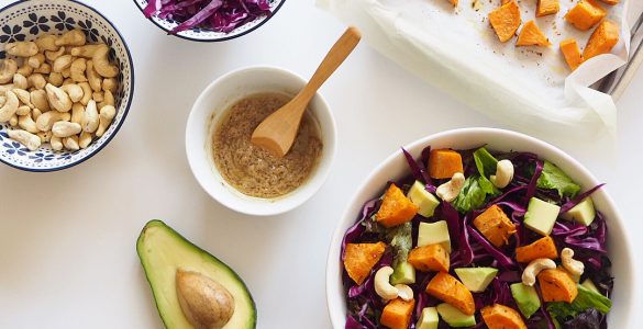 Fırınlanmış Tatlı Patates, Kırmızı Lahana ve Avokadolu Salata