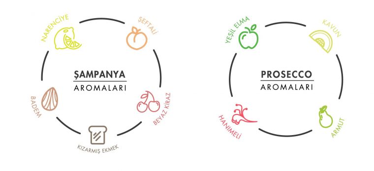 Genel hatlarıyla ikisi de köpüklü şarap olsa da farklı tat skalaları, eşlik ettikleri atıştırmalık çeşitliliği, köpük durumları, fiyat gibi temel konularda birbirinden ayrılan iki ayrı lezzet Prosecco ve Şampanya. Deniz ürünleri hem Şampanya hem de Prosecco ile iyi giderken, Prosecco’da meyve / tatlı aperatifleri yelpazeyi genişletiyor.