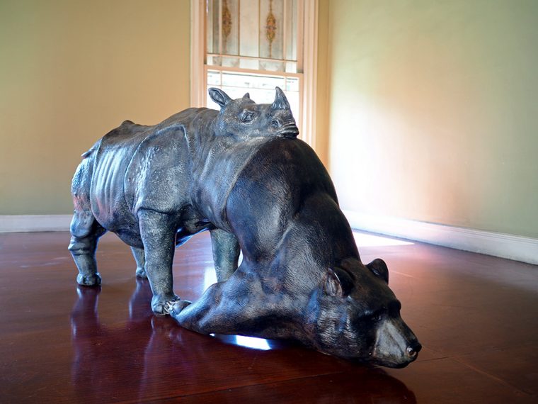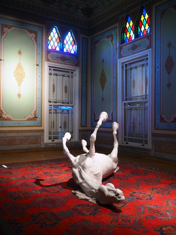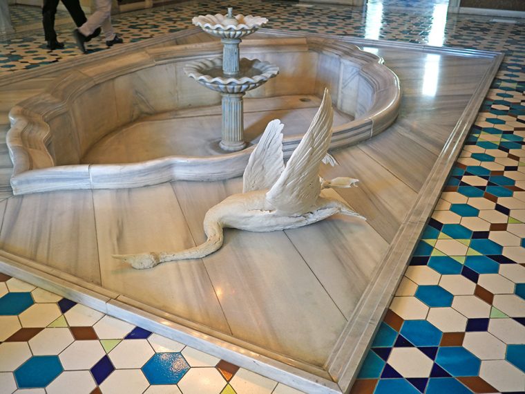 Ziyaretçi köşkten içeri adımını atar atmaz, zamanda donmuş ama buna rağmen adeta devinim halindeki bir paralel evrenle karşılaşıyor. İzleyicinin ilk gördüğü yapıt, az önce oraya düşmüş gibi, kanatlarını iki yana açmış, yerden uzanan, mermer tozundan yapılmış bir kuğu.