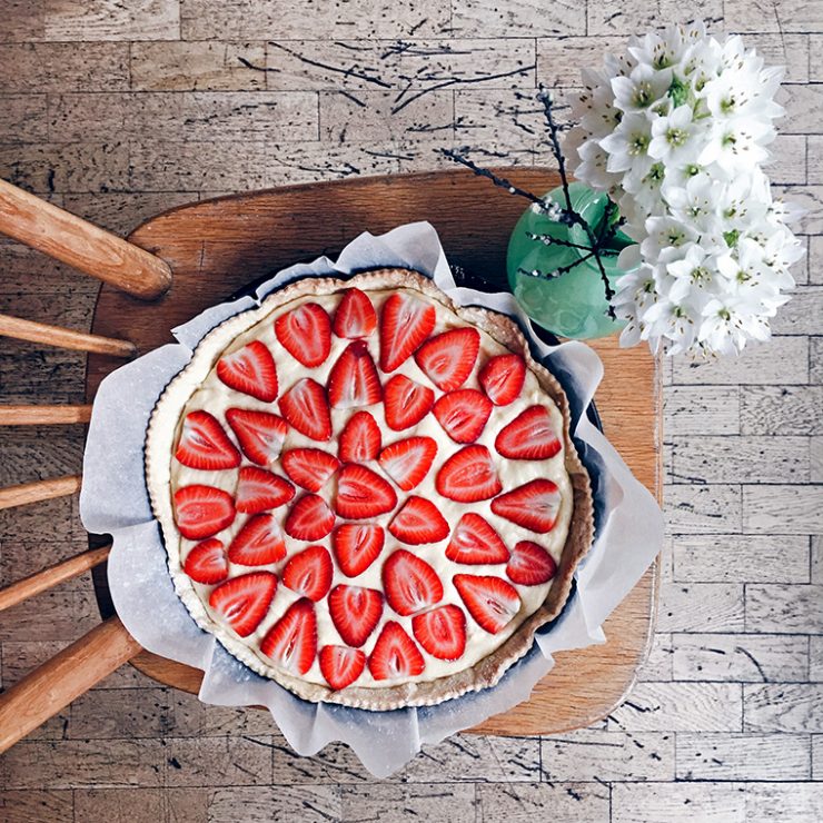 - Tart hamurunun üzerine kremayı dökün, kaşığın sırtıyla eşit olarak yayın. Üzerine de çilekleri dizin. 1 saat daha dolapta soğumaya bırakabilirsiniz.