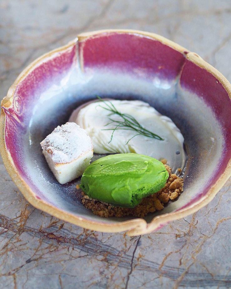 Od Urla’nın tadım menüsünden favorimiz deniz fasulyeli, bahçeden nar ekşili – narlı Seferihisar keçi loru ve tatlı olarak ilginç lezzetiyle yeşil acı biberli, arap saçılı sorbe ve sünger kek.
