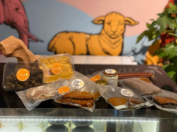 Yemek yemenin yanı sıra vegan ürünler satın alabileceğini bir market kısmı da var.