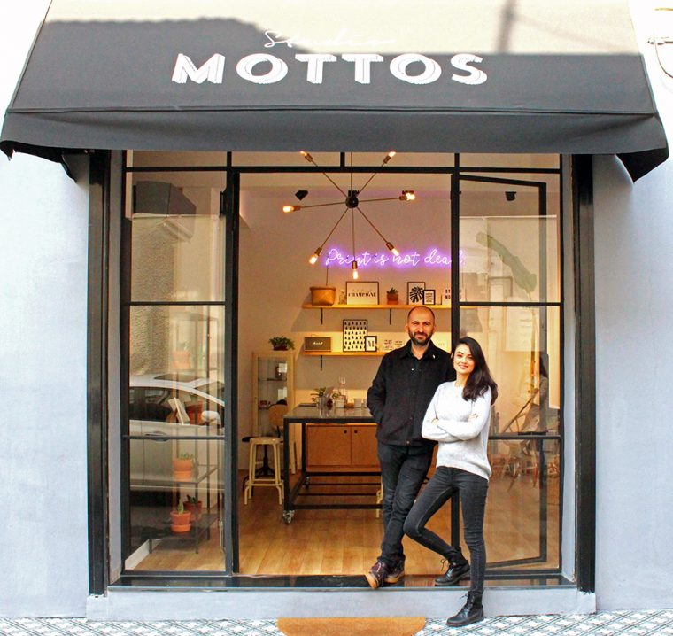 İzmir’in en yenisi. Studio Mottos, Sinan ve Işıl Işık Saydık çiftinin İstanbul’dan İzmir’e taşındıktan sonra kurdukları multi kullanımlı bir sanat stüdyosu. Hikayelerinin başlangıcı 6 sene öncesine kadar gidiyor. Sinan, 2011 yılında dönemin trendlerinin de etkisiyle tipografik çalışmalar yapmaya başlamış. Mottos markası o dönem çıkmış. O yıldan itibaren Mottos Print ismiyle tamamen internet üzerinden posterlerini sunmuş. 2014 yılında Mottos için yaptığı tasarımların önemli websiteleri ve dergilerde yer alması yurtdışı bilinirliğini hatırı sayılır derecede arttırmış. Bu da Mottos’u öncelikli işi yapması için iyi bir fırsat vermiş. 2015 yılında kurumsal işinden istifa edip İzmirli eş durumundan İzmir’e taşınmış. Bir süre evden çalıştıktan sonra 2016’nın Ekim ayında Studio Mottos için hazırlıklara başlamışlar.
