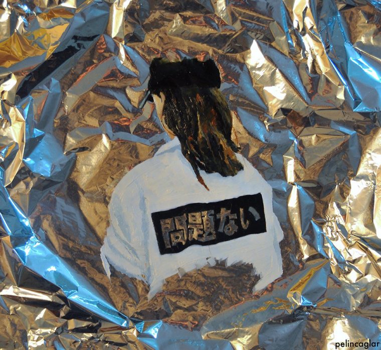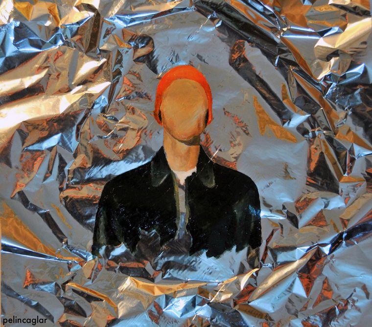 “Folyo çalışmalarımın ilginç bir çıkış noktası var. Verdiğim yemek siparişi folyoya sarılı bir şekilde gelmişti. Yağlı boya ile bir arkadaşımın portresini üzerine çizdim. Renklerin folyodaki duruşu, ışığın yansıması beklediğimden çok daha iyi çıktı ve çalışmalarıma folyo üzerinde devam ettim”