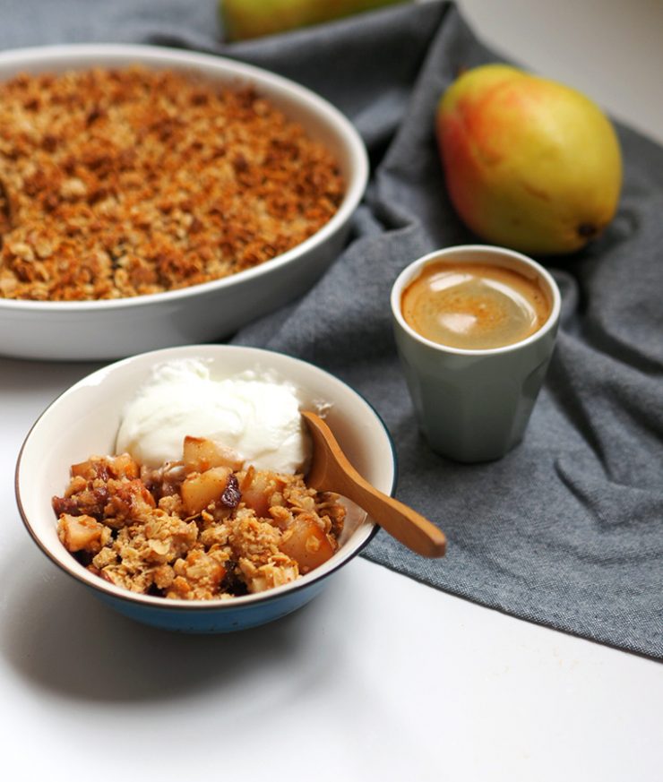 Meyvelerin baharat ve tercihen bir narenciye suyu ile marine edildiği katmanın üzerine tereyağı, un ve şeker ile yapılan hamur ufalanarak pişen crumble’da rahatlıkla farklı alternatifler deneyebilirsiniz. Meyve kısmında tek bir çeşit veya birkaç meyvenin kombinasyonunu kullanabilir, baharatlarla tatlandırma işleminde damak zevkinize göre yaratıcılığınızı kullanabilirsiniz. Ben bu tarifte meyve katmanında taze ve kuru meyveler kullanırken hamur katmanında da beyaz un, tereyağı ve şekere sağlıklı alternatifler kullandım.