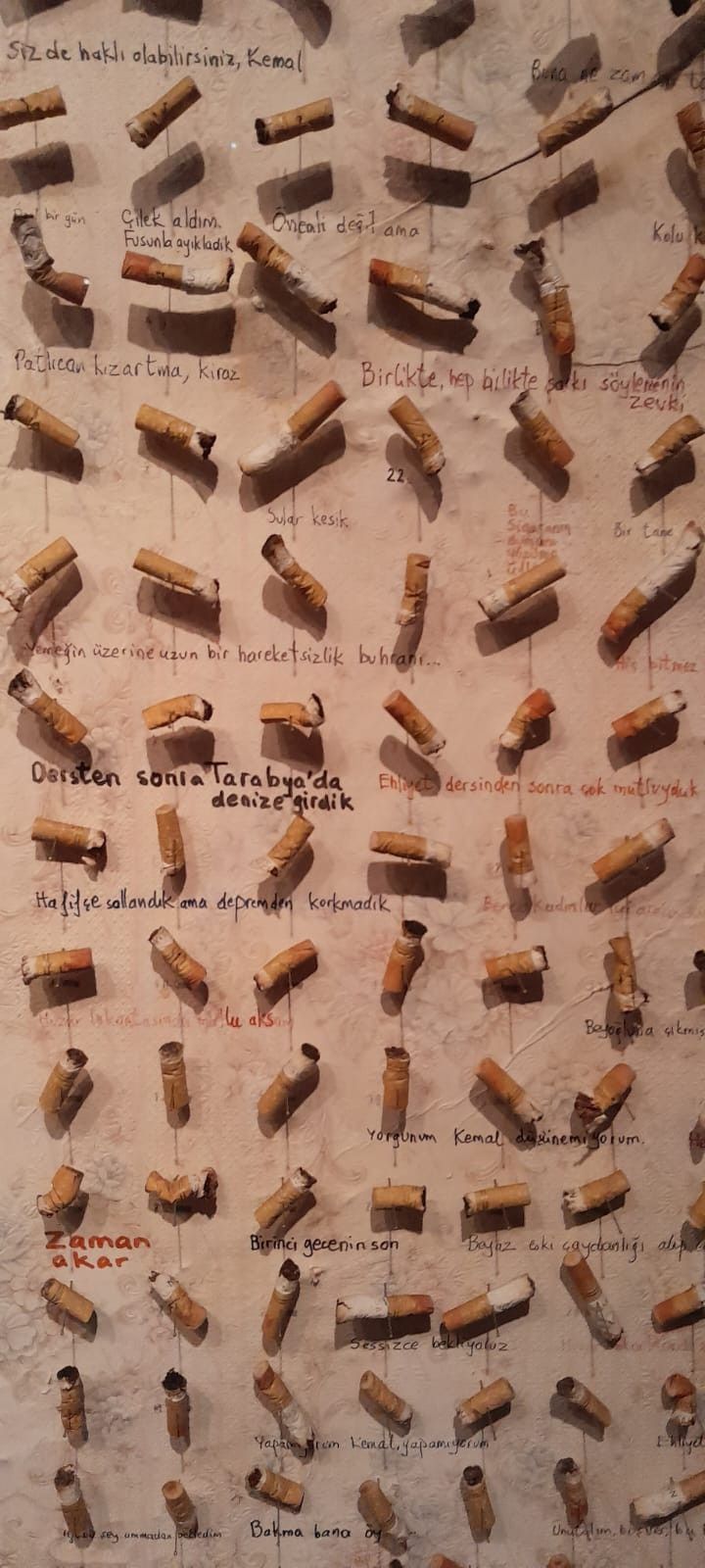 Masumiyet Müzesi birçok etkileyici eşyaya ev sahipliği yapar. Bunların en çarpıcılarından biri, Füsun’un içtiği sigaralardan kalan izmaritlerdir. Bir duvarı baştan sona kaplayan bu izmaritler, Kemal’in yaşadığı obsesif aşkı gözler önüne serer; duyguyu neredeyse fiziksel bir şeye dönüştürür.