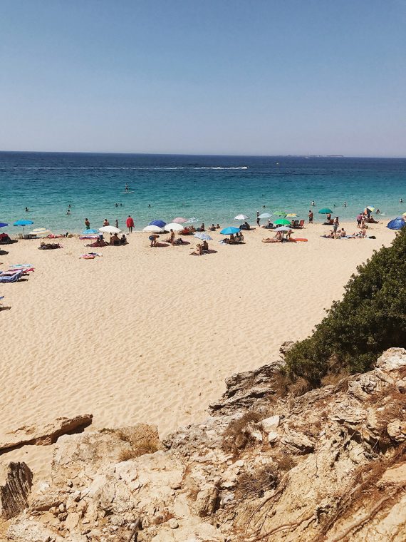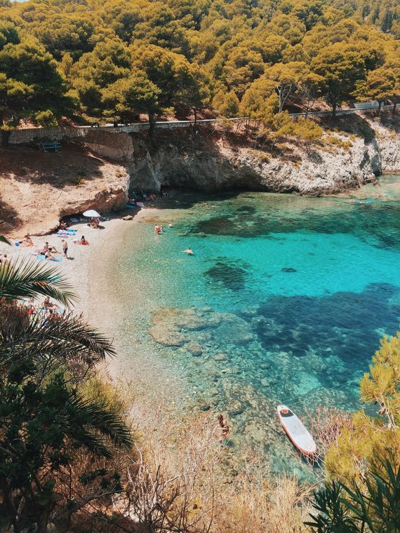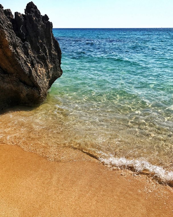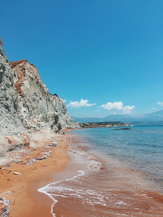 Bunlardan ilki Myrthos merkeze 30 km uzaklıkta. Taksi 45, 1 saatten fazla sürüyor üstelik başka bir otobüse aktarma falan yapmak gerekiyor J Seyahat dergilerinin her sene güncellediği En İyi Plajlar listelerinde yer alıyormuş. O virajı dönüp yukarıdan koyu gördüğünüzde nedenini anlıyorsunuz. Yemyeşil ormanların sonunda çakıl taşları ve Pantone mavi paleti gibi bir deniz. Dağlık yoldan aşağı inmeden önce çektiğiniz hiçbir fotoğraf gördüğünüz gibi olmadığı için sizi tatmin edemiyor. Aşağıda hiç tesis yok. Yanınıza su, atıştırmalık ve en önemlisi şemsiye alırsanız tadınızı kaçıracak her şeyin önüne geçmiş olursunuz.