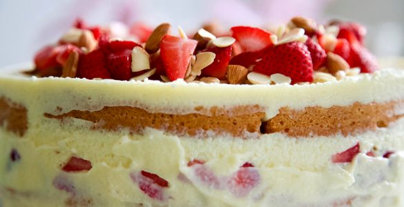 Beyaz çikolatalı pasta meyveli pasta severlerin göz bebeğidir. Bir de içinde çilek olmasının yanı sıra meyveyi dengeleyen badem de varsa o pasta iç baymayan ve sizi sonsuz mutluluğa boğacak bir kutlama sebebi olacaktır...