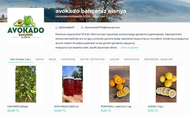 Narenciye tarımının kalbi Antalya’dan bir üretici olan Avokado Bahçeniz isminden anlaşılacağı gibi yoğun avokado hasadı yapan bir aile çiftliği. Doğal ve temiz bir tarım anlayışıyla Alanya’da üretim yapan Avokado Bahçeniz’de mevsimsel olarak portakal, greyfurt, limon gibi narenciyeler ve erik, çağla, badem gibi yine ılıman iklimin taze meyveleri bulunuyor. Haftanın belirli günleri hasat ve gönderim yaparak Türkiye’nin her yerine bu doğal ürünleri ulaştırıyorlar.