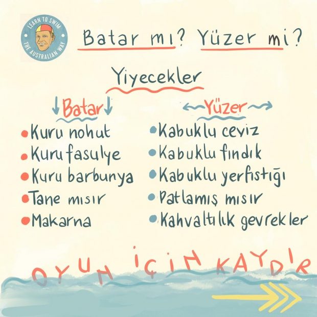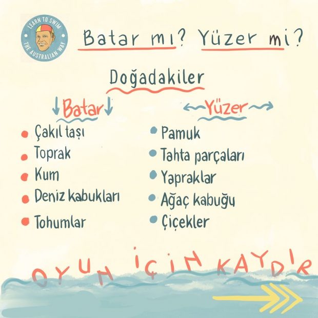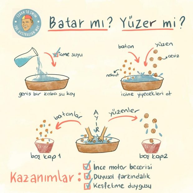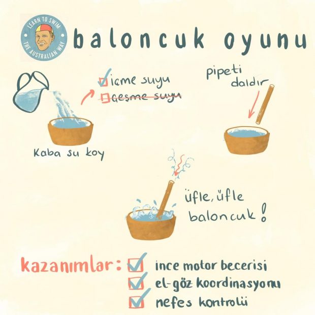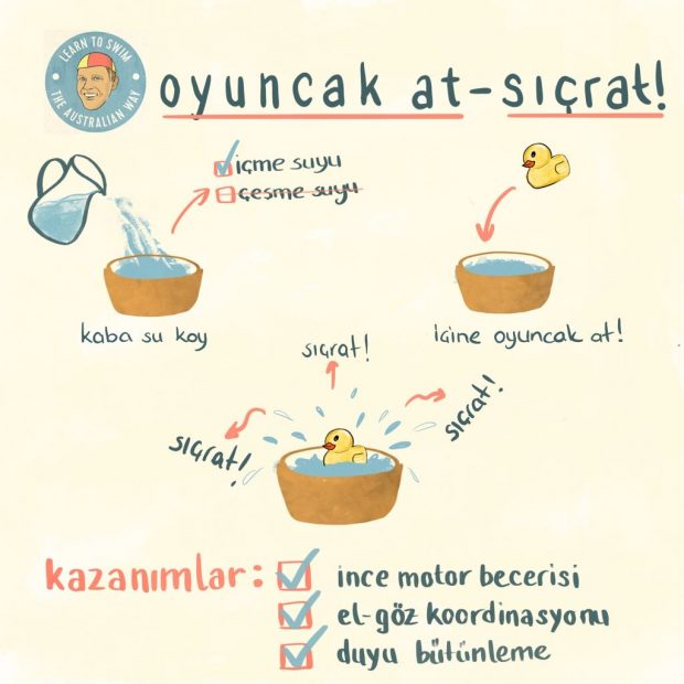 Deniz kenarında kullandığınız kovayı banyo zamanında da kullanmanızı öneririm. O kovayla her banyo zamanı “İsim 1-2-3” tekniğini kullanarak, ona nefesini tutmayı öğretebilir, onu ilk dalışına hazırlayabilirsiniz.