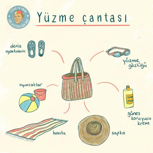 Önce güvenlik ve konfor. Güneş kremi, siperlikli şapka ve UV korumalı mayo favorilerim. Sonra sınırsız eğlence gelir. Bütün banyo oyuncakları denize!